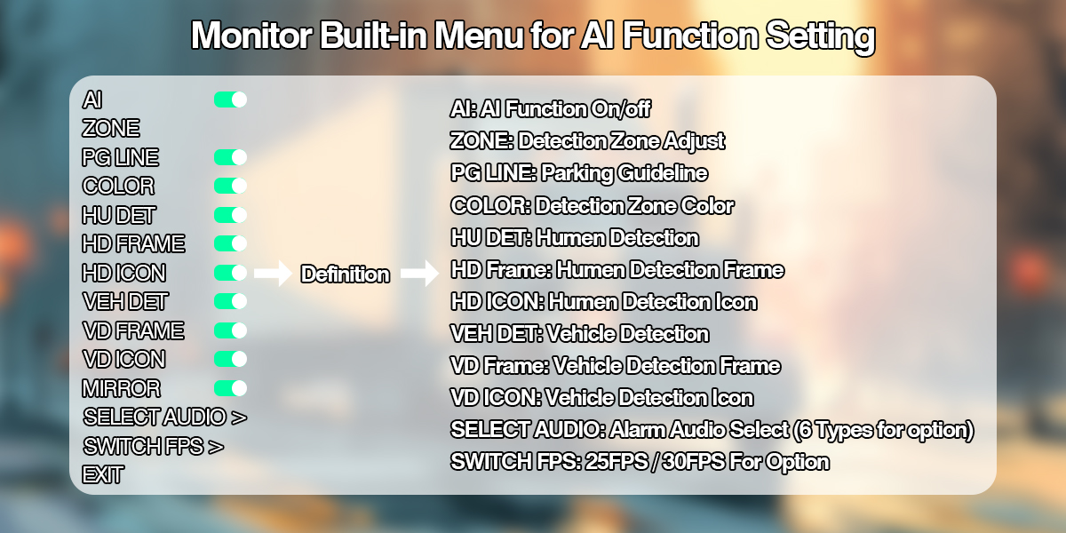 Líder do carroCalibração do AI do apoio do sistema de monitoramento da detecção de ponto cego do AI BSD de 7 polegadas, uma solução de câmera de IA que oferece suporte à detecção de pedestres e veículos, aumenta significativamente a segurança ao dirigir, monitor com menu de calibração de IA integrado, permite ao usuário ajustar a área de detecção, ativar/desativar a exibição colorida da zona de detecção, tipo de áudio de alarme, exibição de ícones de veículos e pedestres, seleção de objetos de detecção, etc.