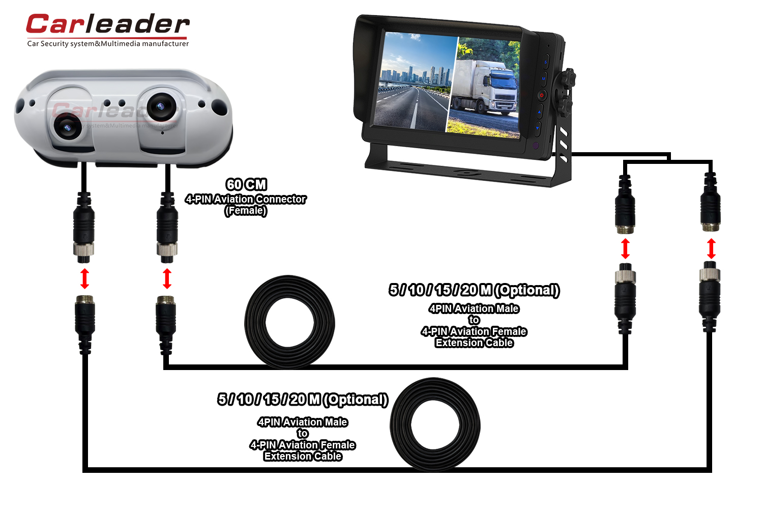 A segunda solução terá dois cabos de extensão, mas a definição da câmera é um conector de aviação padrão de 4 pinos, contanto que seu cabo de extensão seja um conector de aviação padrão de 4 pinos, ele será compatível com seu cabo de extensão.