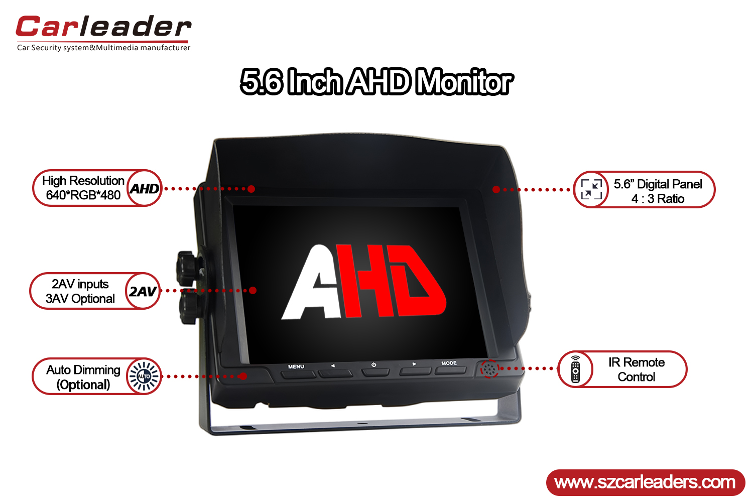 Líder do carro5,6 polegadas 2CH AHD entra no monitor alternativo do veículoideal para caminhões, ônibus, trailers e qualquer veículo onde maior visibilidade traseira e segurança sejam prioridades. Sua construção durável, exibição nítida e recursos práticos tornam-no um componente confiável para sistemas modernos de câmeras de veículos.