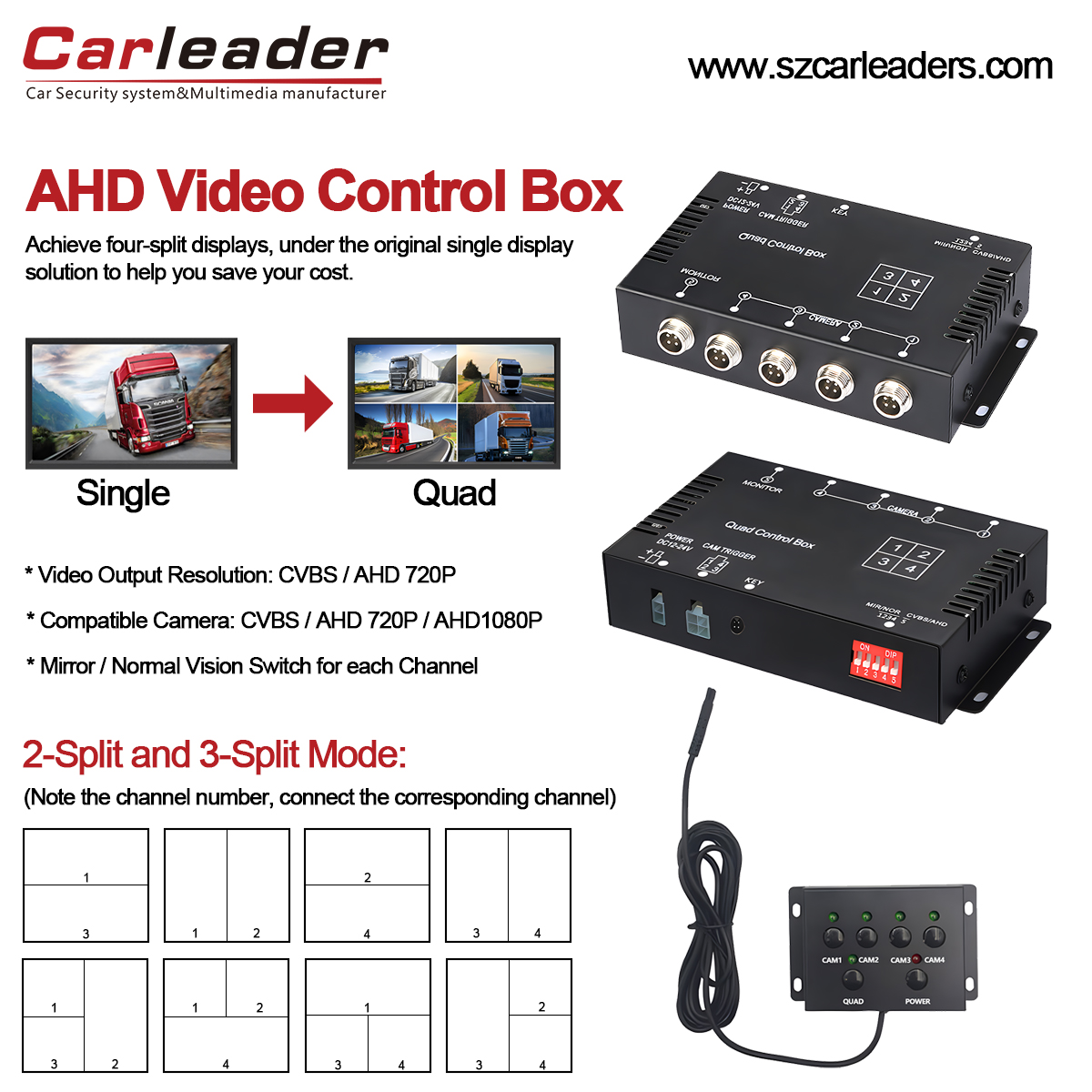 Vamos falar sobre o que você precisa saber sobre o CarleaderProcessador de vídeo de caixa dividida AHD Quad Viewpara veículos pesados. A caixa de controle quad split AHD é um dispositivo importante para um sistema de monitoramento CCTV de veículo. A caixa de controle de divisão de vídeo do caminhão de ônibus suporta a transformação de um único monitor em um monitor de visualização quádrupla e pode se conectar a 4 câmeras de carro AHD. A seguir está uma explicação detalhada das funções, recursos e casos de uso típicos da caixa de controle de vídeo da câmera retrovisora AHD.