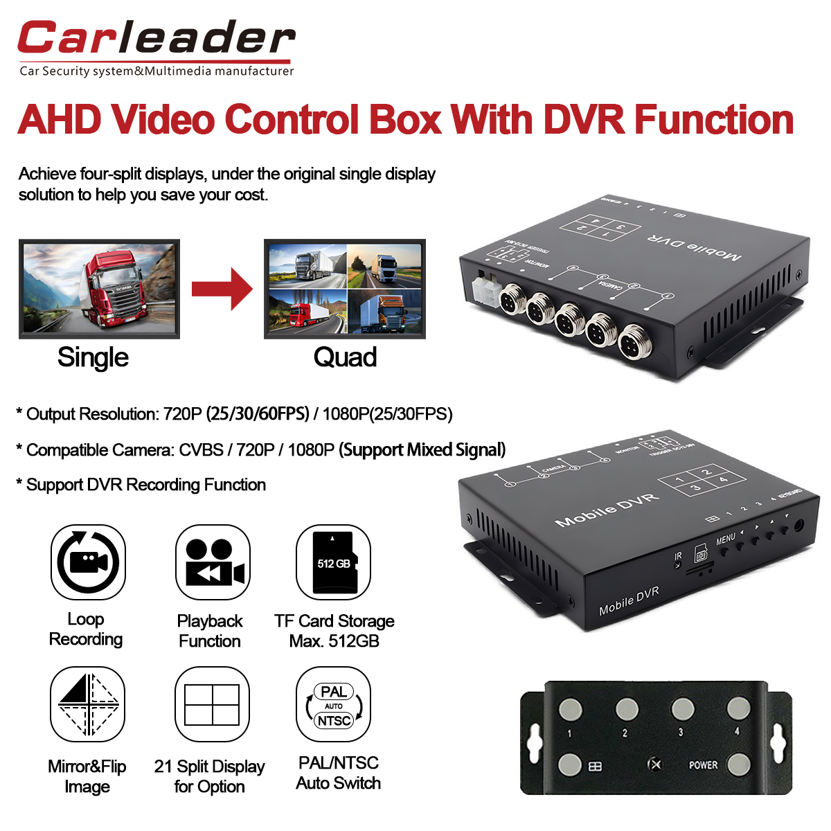 Eleve o sistema de vigilância de veículos comCarleader 1080P AHD Quad Split Display Processador de vídeo com suporte para gravação de vídeo, uma versátil caixa divisora de vídeo 4CH integrada com recursos avançados de gravação DVR. Projetada para monitoramento confiável, flexível e de alta definição, esta unidade compacta é ideal para gerenciamento de frotas, veículos de segurança ou qualquer aplicação que exija sistema de gravação e exibição de entradas de múltiplas câmeras.