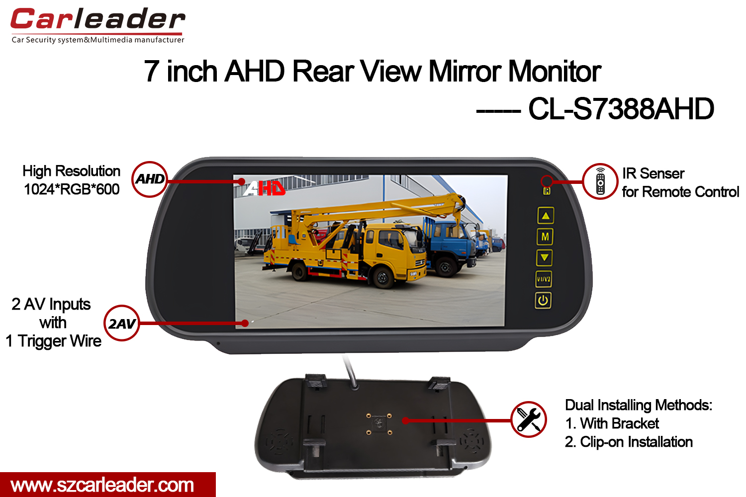 Líder de carroMonitor AHD do espelho retrovisor TFT LCD de 7 polegadasé um monitor AHD de espelho automotivo de 7 polegadas de alto desempenho projetado para oferecer clareza e versatilidade excepcionais para sistemas modernos de monitoramento de veículos. Combinando recursos avançados com um design fácil de usar, este monitor garante um desempenho confiável em diversas condições de condução.